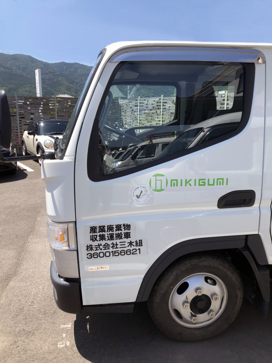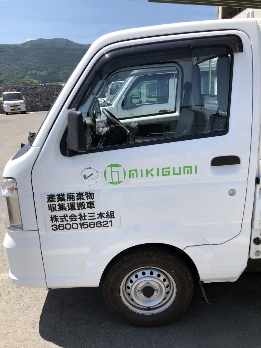 三木組では、社用車の「mikigumi」ロゴ隣に「コウノトリを応援しています」マグネットを貼り、