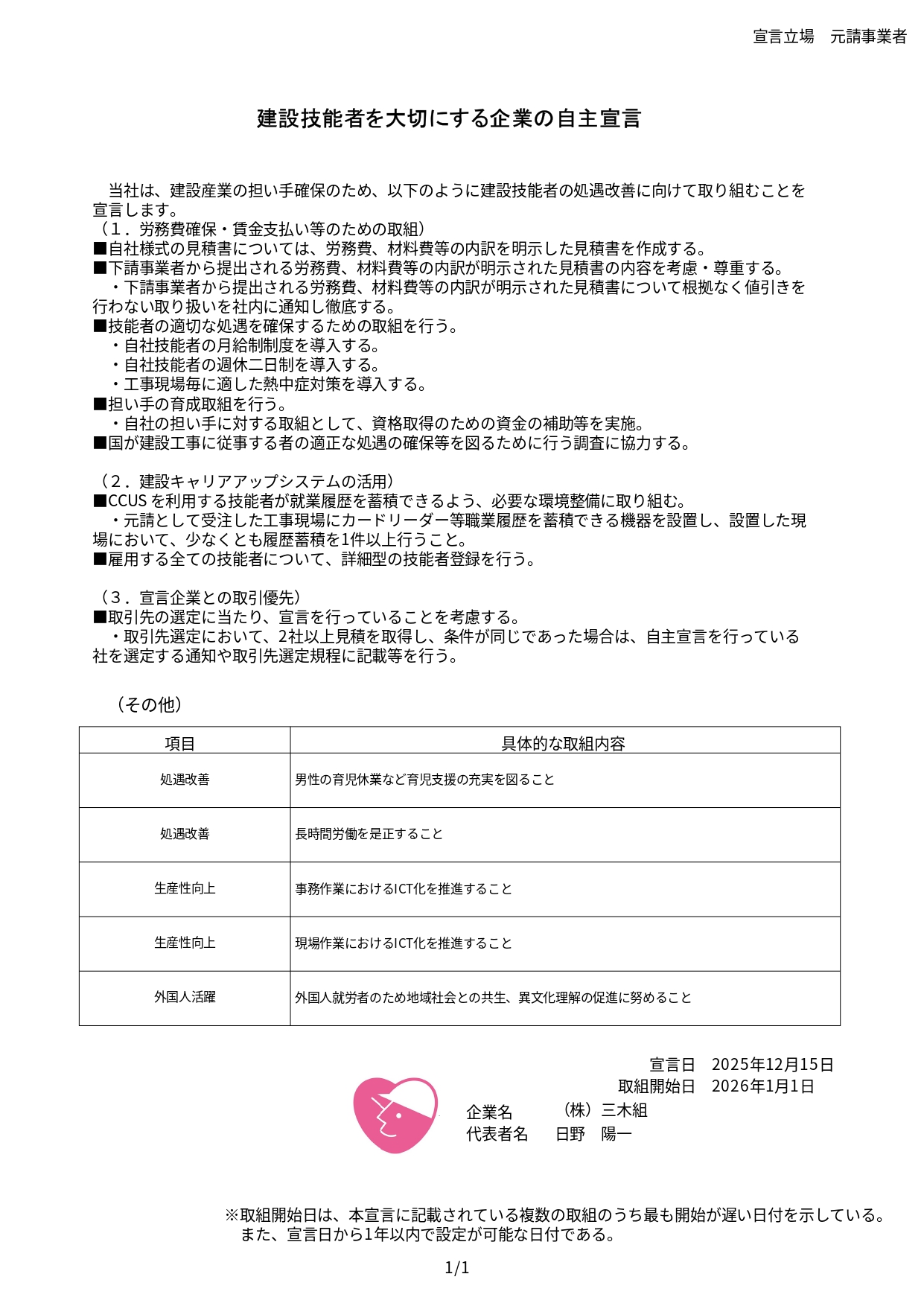 このたび株式会社三木組は「建設技能者を大切にする企業の自主宣言」を行いました。
