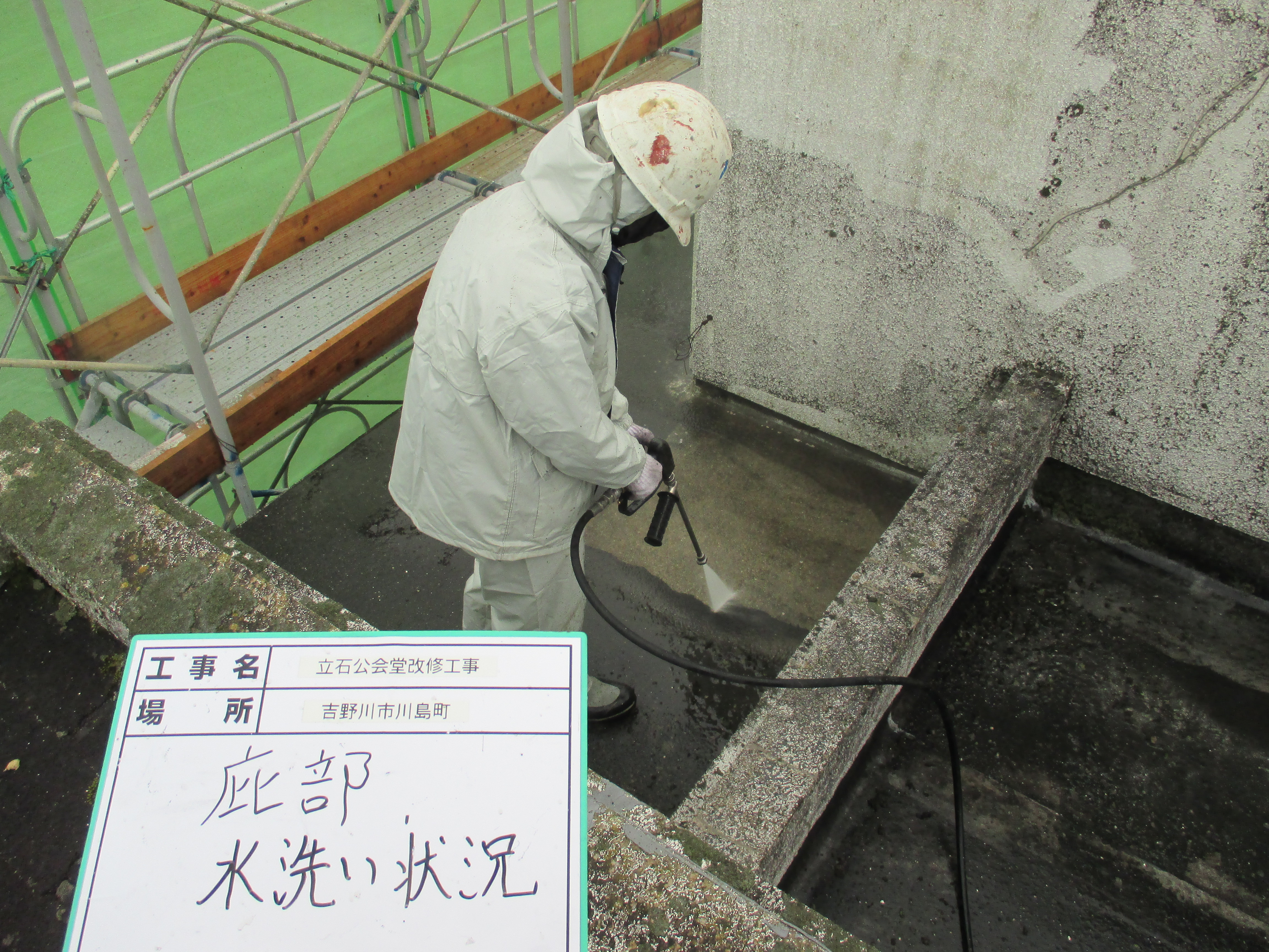 再塗装を行うため、長年の汚れを洗い流しています。