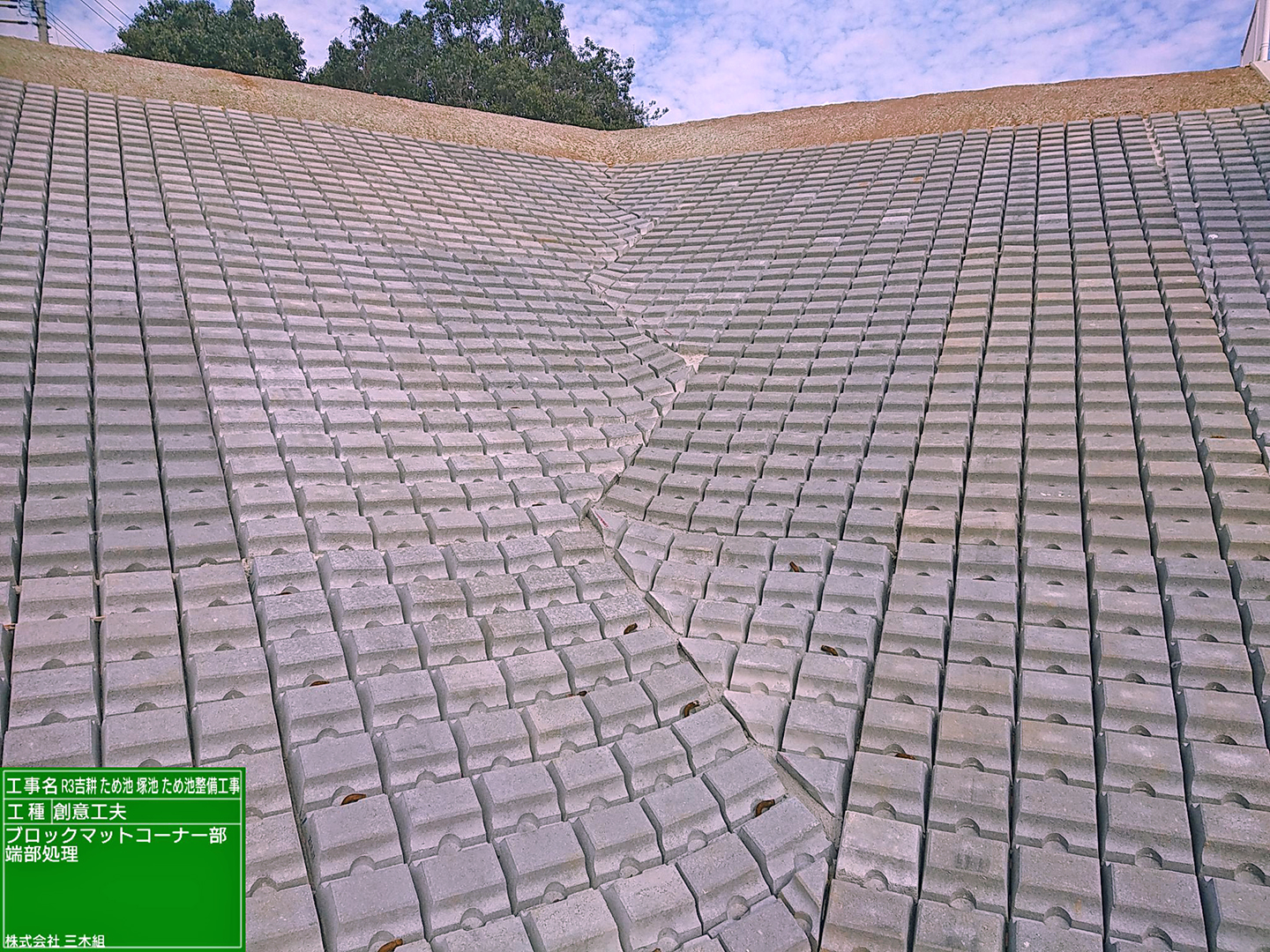 堤体の浸食を防ぐ法面保護のためのブロックマット設置では、