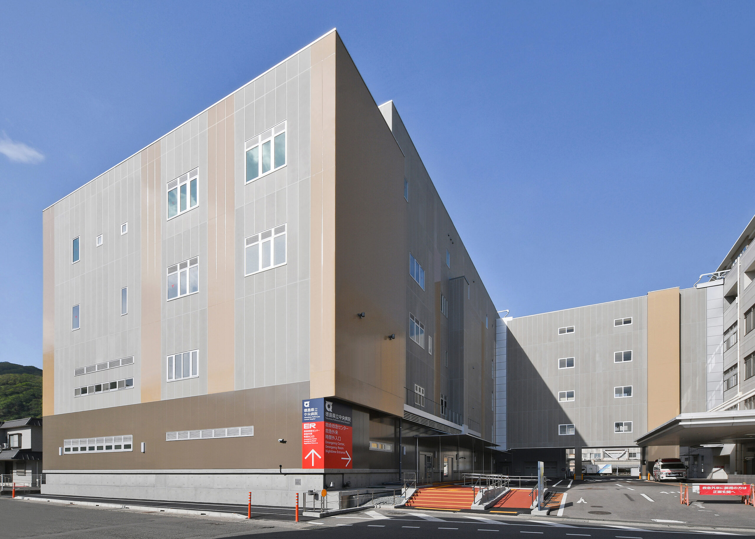 救急・感染症対応、災害対応、人材育成及び地域医療支援の複合的な機能を備えた、県立中央病院ER棟。
