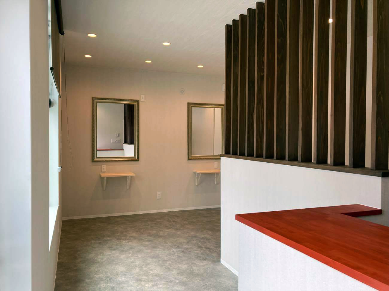 美容室の店舗側は造作した木製格子・カウンターを塗装によりアンティークな仕上げに。