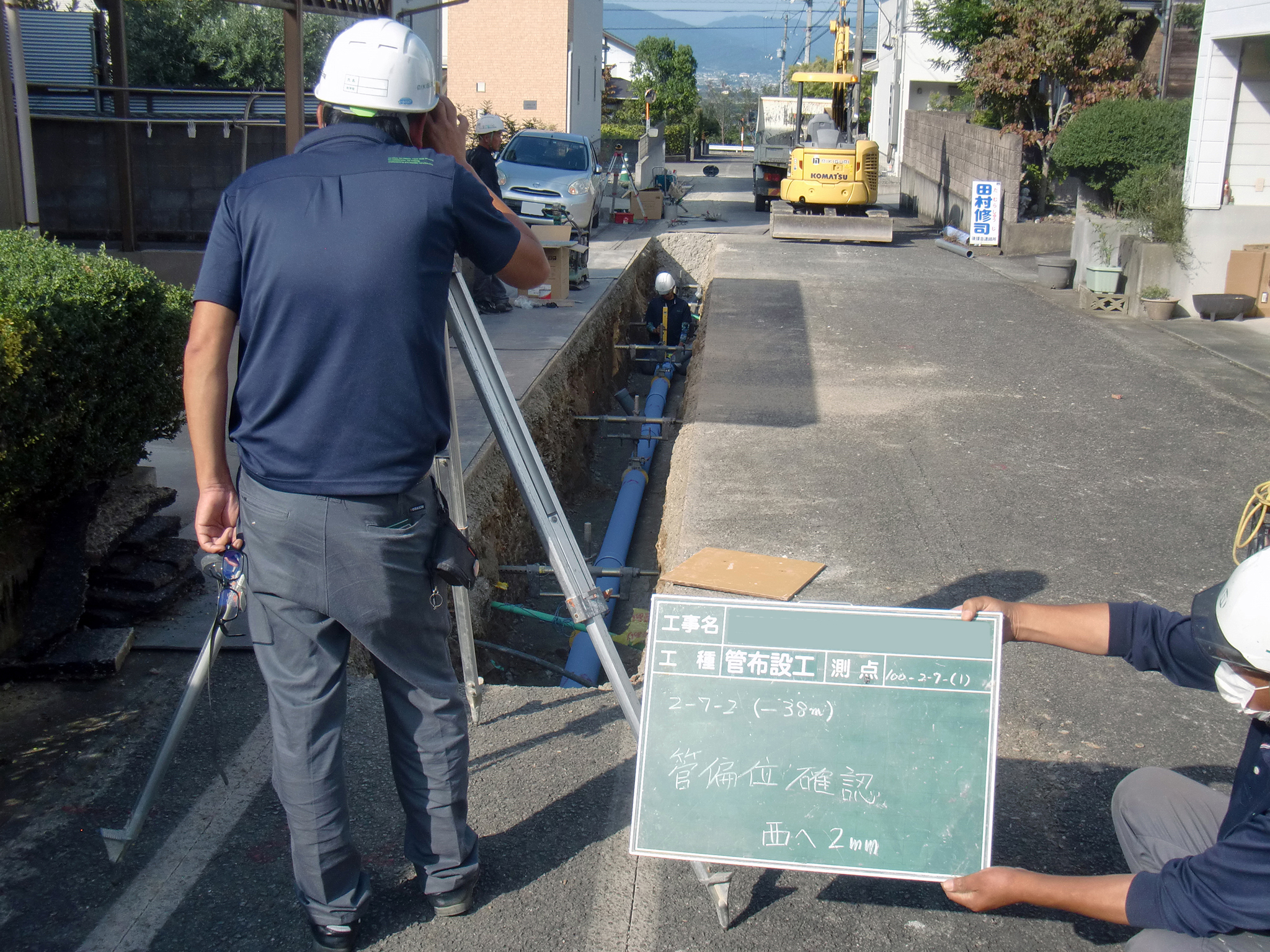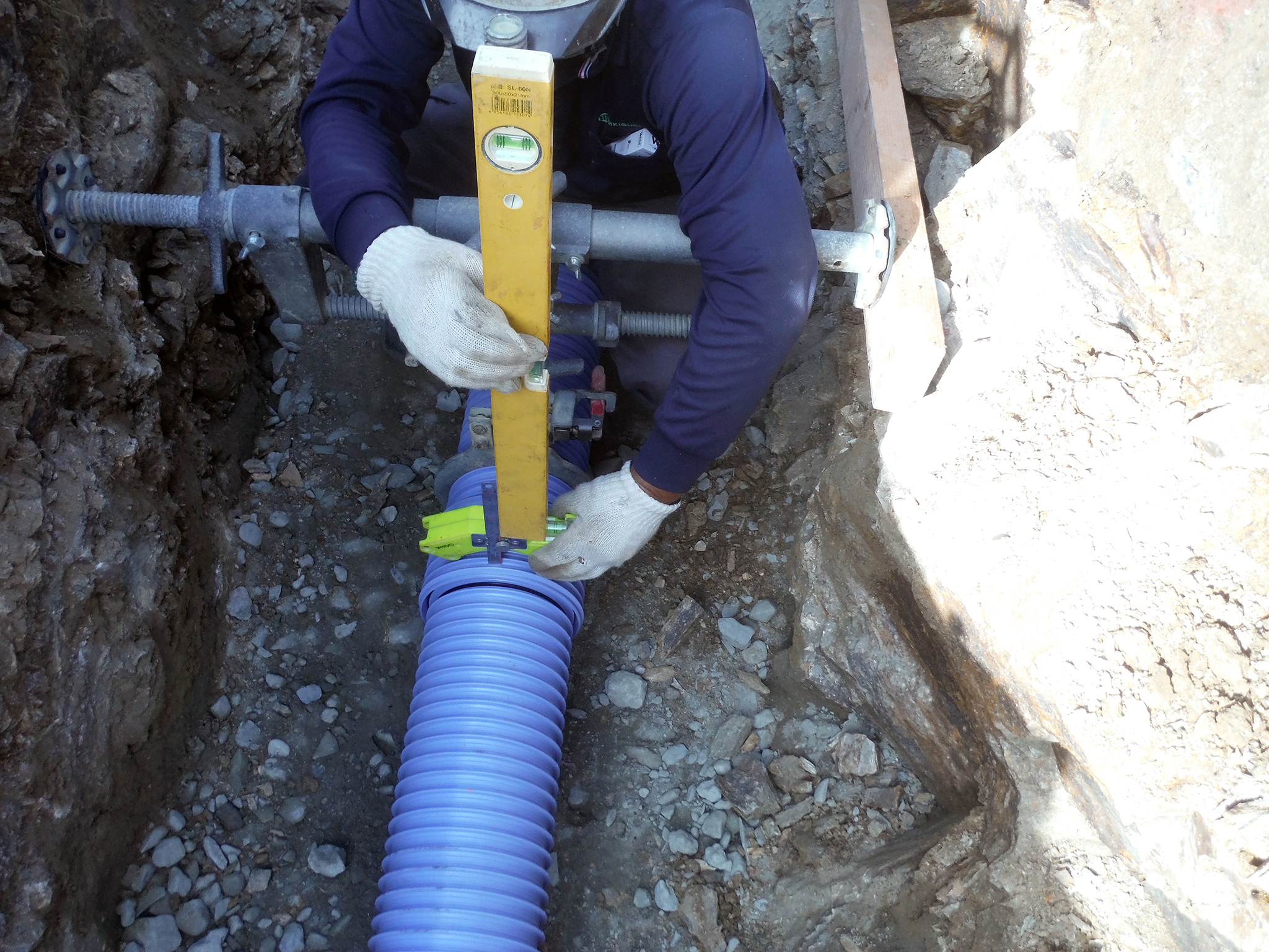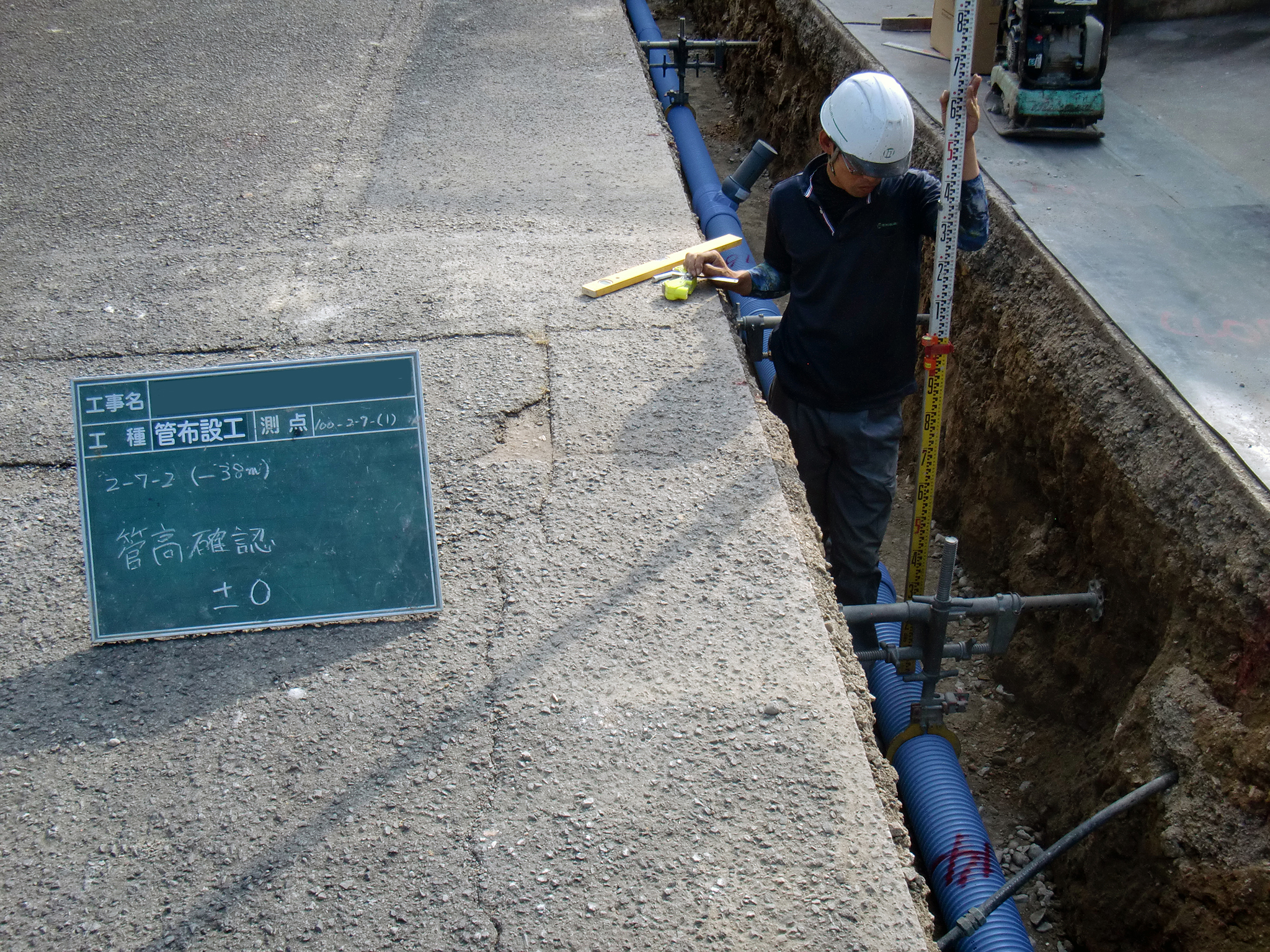 下水管の埋め戻し時には、管の方向(中心線の変位ズレ・基準高さ)の確認を行い、